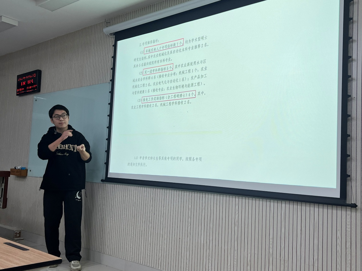 随后,多位学长学姐结合自身经历,从不同维度分享保研干货。刘顺同学以 “本校推免” 为核心,细致区分了 “普通推免” 与 “专项推免” 的差异,帮助同学们精准把握不同推免路径的特点;同时,他还分享了本科阶段的学习心得、校内面试的实用技巧,以及联系导师过程中的注意事项,内容兼具实用性与针对性。王碧源同学则聚焦 “卓越农林人才计划” 保研政策,深入解读政策细则与申报要求;并结合自身参与大创项目、数学建模竞赛的经历,生动讲述了本科期间开展科创工作的方法与思路,为有科创意向的同学提供了宝贵参考。