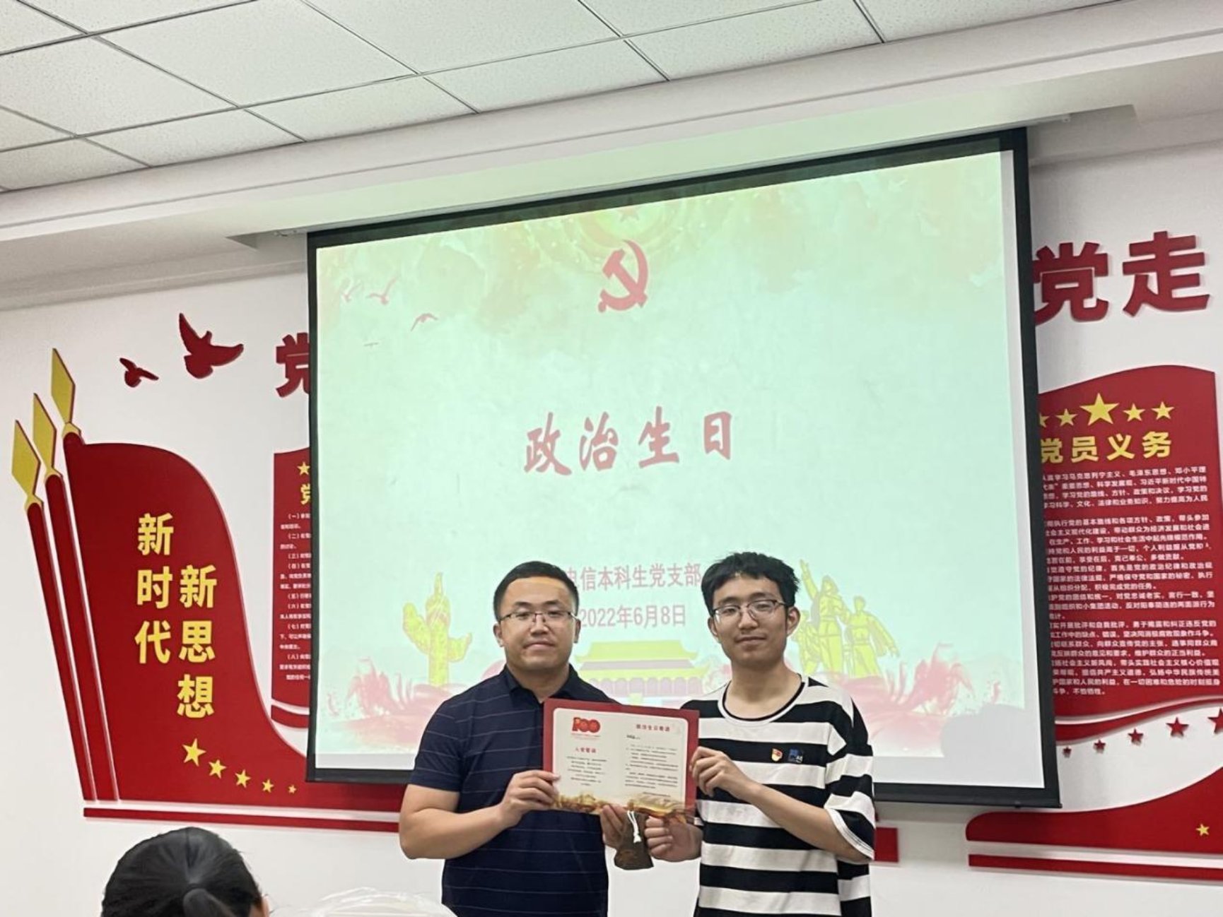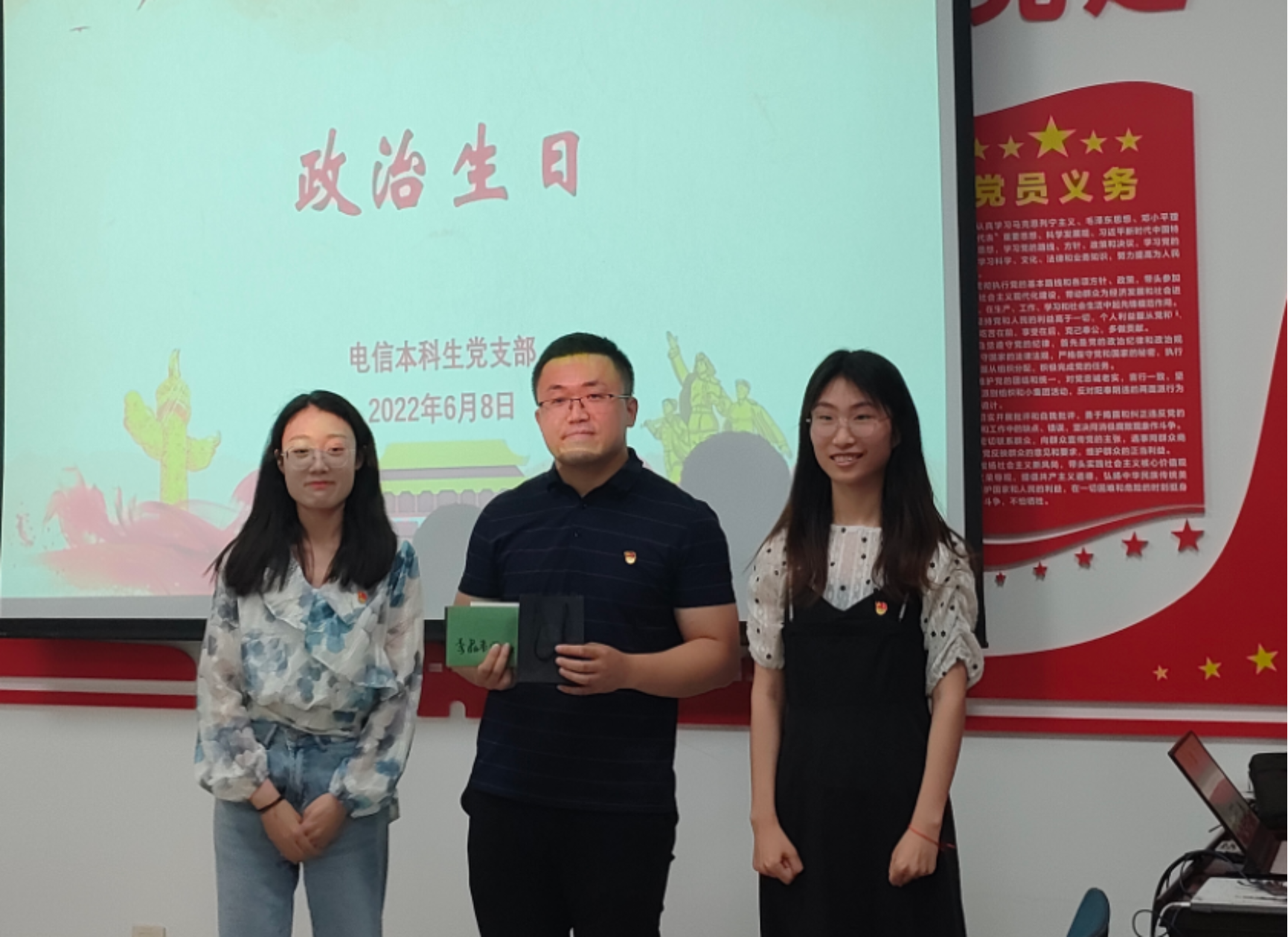 为进一步引导广大党员强化身份意识、宗旨意识和责任意识,在工作和生活中时刻以党员标准严格要求自己,切实发挥先锋模范作用,在毕业生党员在校的最后一月里,365英国上市官方网站电信本科生党支部于2022年6月8日晚7点在365英国上市官方网站三楼党团会议室开展“政治生日暨毕业座谈会”主题活动,会议由雒鹏鑫同志和秦泽倩同志主持,电信本科生党支部成员全体参与。