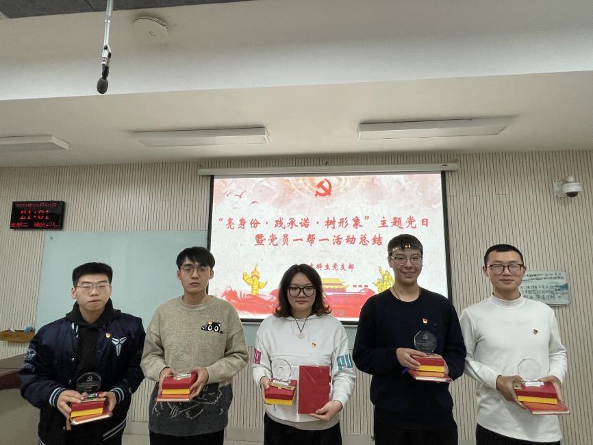 首先,由电信本科生党支部伍景涛书记带领支部同志举起右拳,朗诵入党誓词,重温自己入党的决心和信念。通过重温入党誓词,使党员同志们牢记党对自己的要求,增强党性观念,终身牢记自己的誓言,提高对党的事业的责任感和自觉性,时刻以誓言来激励自己,以实际行动履行自己的誓言,为共产主义奋斗终身。随后伍景涛为五位过政治生日的同志颁发了水晶杯、笔记本及书签,水晶杯上不仅雕刻了各位党员姓名,还刻着“不忘初心,牢记使命”8个字,水晶杯意在警醒各位同志牢记党员身份,不忘入党初心;笔记本和书签意在鼓励各位同志加强政治理论学习,增强党性修养。