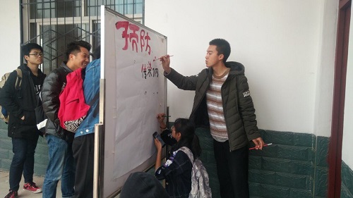 下午两点半,动医和机电的小伙伴们在理公司门口集合完毕。一起骑车去往蒋家寨,开始本次的宣传活动。同学们在活动前一晚召开工作安排会议,提前设计好板报,打印好宣传单,明确每位同学的分工。到达目的地后,大家迅速开始了活动。同学们挨家挨户进行着分发宣传单并就预防传染病知识进行讲解。负责画板报的同学也积极行动起来,画画、写字、调颜料。一切进行的有理有序。
