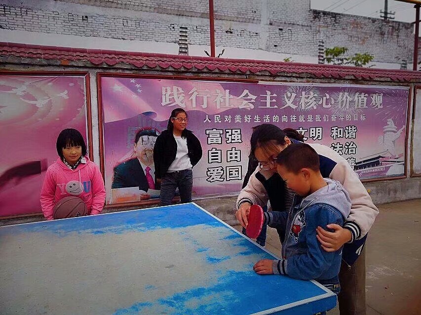 志愿者教小朋友打乒乓球
