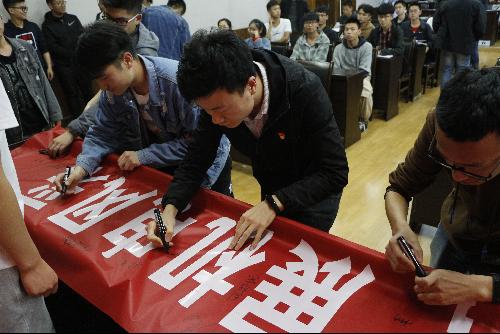 最后进行了“学习纪律强化月”横幅签名活动。公司领导、全体学工队伍以及各班学风评议员在横幅上签名,大力支持公司本次活动。
