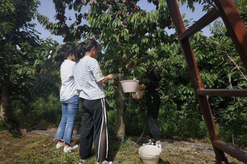 六月正值樱桃成熟季,来到庄园后,田叔叔很热情地接待了队员们。简单地为队员们介绍了庄园后,田叔叔为队员们分配的任务是采摘樱桃。队员们也提前准备了草帽和水杯等,做好了采摘樱桃的准备!田叔叔告诉队员们:摘樱桃一定要注意不要捏着樱桃,这样会造成果实的损伤,只要抓住樱桃的果柄,轻轻用力就可以轻松摘下樱桃了。叔叔还特意强调了:一定保留好樱桃的果柄,保证樱桃的新鲜。在叔叔的细心指导下,使者们迅速开始了自己的工作。队员们循序渐进,摘完低处的樱桃后接着摘高处的樱桃,一簇摘完接着摘另一簇,忙得不亦乐乎。临近中午,阳光渐渐变得灼热,温度也越来越高,但是田园使者们没有丝毫懈怠,采摘工作仍如火如荼地进行着。经过两个半小时的采摘,队员们采下的樱桃装满了整整的三大筐。看着筐中红彤彤的樱桃,看着自己劳动的果实,队员们都露出了喜悦的笑容,都认为这就是劳动的快乐了吧。
