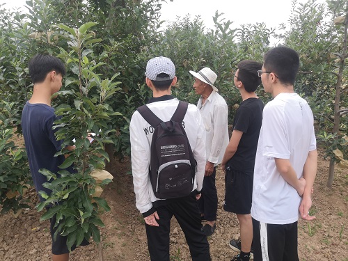 一位75岁,从事果树种植26年的爷爷在得知队员们来意后,非常热情的带领队员们参观了苹果树、桃树、樱桃树等多片果园,还向队员们一一介绍了不同果树在种植过程中的护理方法,以及不同的果树种植、同一果树种植的不同阶段果园中农机设备的使用情况。