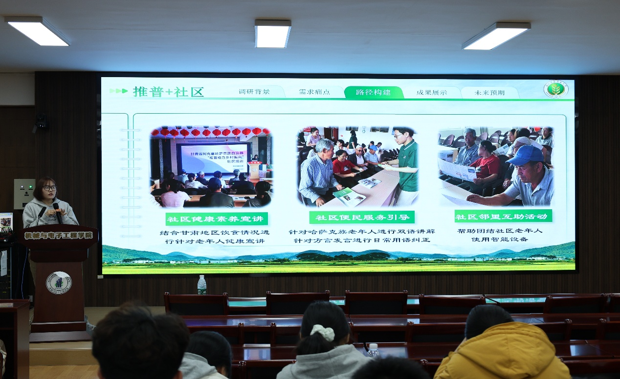 最后,来自马克思主义公司的迪娜·波拉提同学分享了在以语言文字为桥,赋能民族地区乡村发展活动中,她们对区域经济文化现状深入社区调研的经历。她们先构建了“推普+”六维融合模式,有条理地进行调研、人才、文化、社区、实践、产业六个方向开展活动,为我们呈现了以语言的力量助力乡村振兴的完整途径。