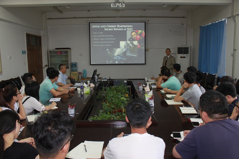 Karkee博士先介绍了华盛顿州中部的典型农业及其团队的研究领域。之后,详细介绍了其在智能农业装备、苹果采摘机器人、樱桃振动采收、果树和浆果灌木修剪机器人技术等方面的研究进展,特别是传感器融合技术应用于苹果的精准识别、苹果分层机器视觉系统以及苹果的振动采收获等方面。会后,在场师生就报告会以及自己研究课题中的难点问题与ManojKarkee博士进行了深入的讨论与交流,拓宽了研究思路。