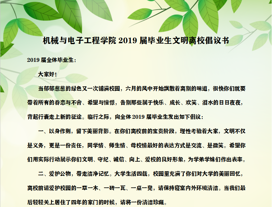 » 2019届毕业生文明离校倡议书