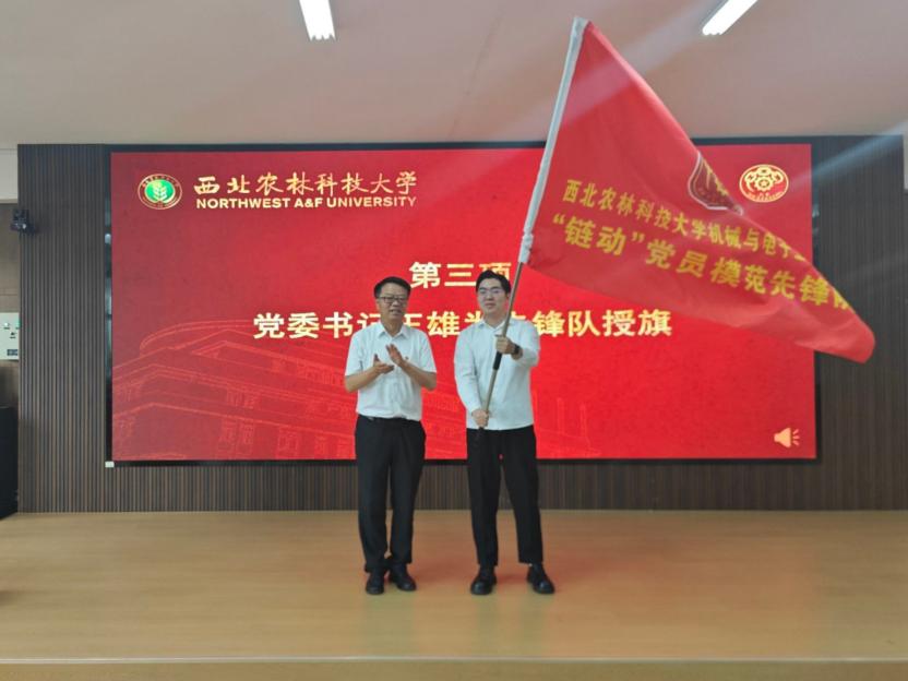 会上,党委书记王雄向先锋模范队代表刘敬源授旗。