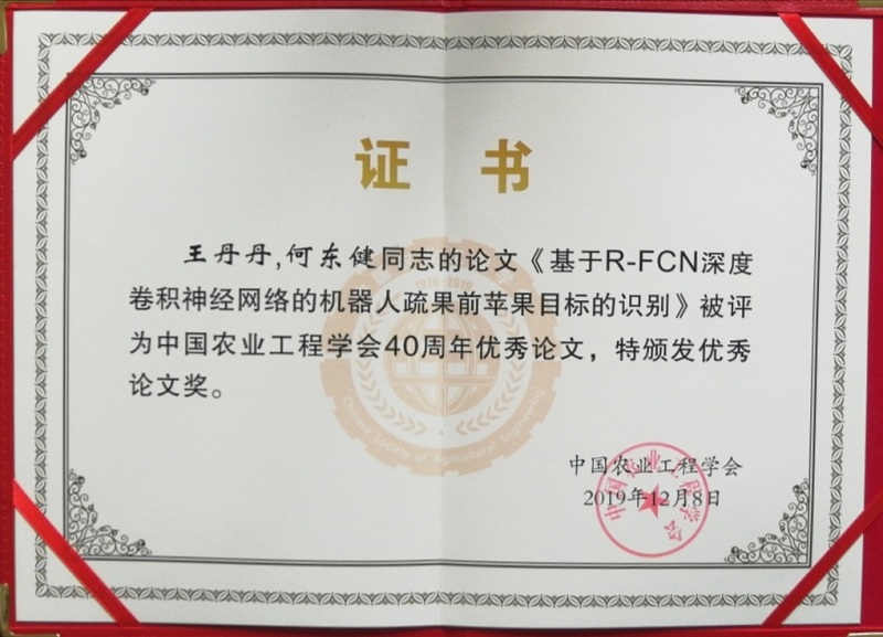 公司何东健教授的《基于R-FCN深度卷积神经网络的机器人疏果前苹果目标的识别》、傅隆生副教授和崔永杰教授的《基于卷积神经网络的田间多簇猕猴桃图像识别方法》两篇论文荣获中国农业工程学会40周年优秀论文奖。