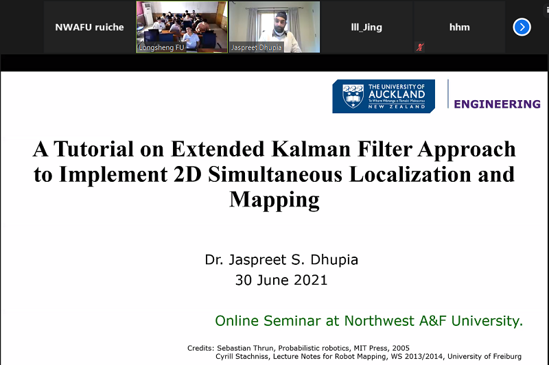 6月30日上午,新西兰奥克兰大学Jaspreet Dhupia博士在线上为师生做了题为“A Tutorial on Extended Kalman Filter Approach to Implement Simultaneous Localization and Mapping (SLAM)”的学术报告。来自不同公司近60多名师生参加此次线上会议。365英国上市官方网站傅隆生博士主持此次报告会。