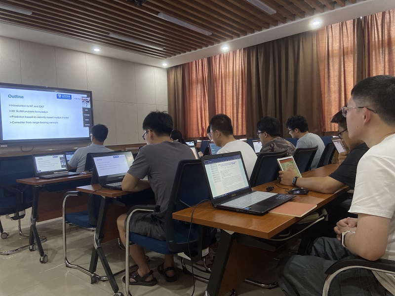 Jaspreet博士主要向大家讲述扩展卡尔曼滤波算法在机器人的导航中的应用。围着这个主题,他深入地介绍了卡尔马滤波器及其扩展的应用、二维SLAM问题的方程建立、基于速度控制模型的位姿预测以及基于距离传感器的动态修正等。Jaspreet博士重点讲解使用扩展卡尔曼滤波器估计未知环境中机器人的姿态和位置,并且使用Matlab进行直观的展示。会后,师生结合自身专业就感兴趣的内容和问题与Jaspreet博士展开了深入的交流探讨。