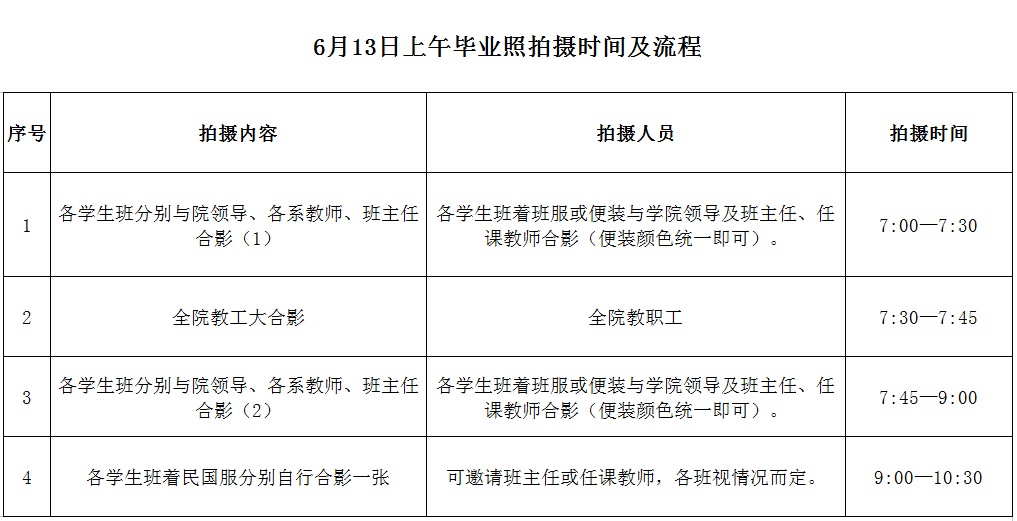 2、请广大师生提前安排各项工作,准时于6:50在公司楼前集合照相。本科生以班为单位,由班干部负责召集本班员工,并邀请班主任、任课教师照相。