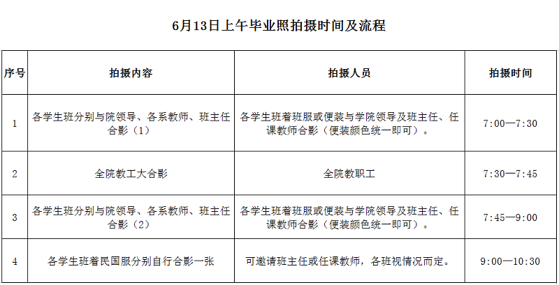 2、请广大师生提前安排各项工作,准时于6:50在公司楼前集合照相。本科生以班为单位,由班干部负责召集本班员工,并邀请班主任、任课教师照相。