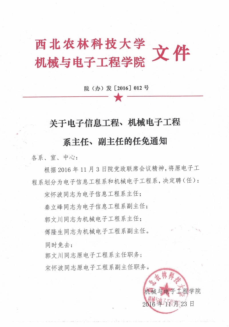 院(办)发[2016]012号关于电子信息工程、机械电子工程系主任、副主任的任免通知